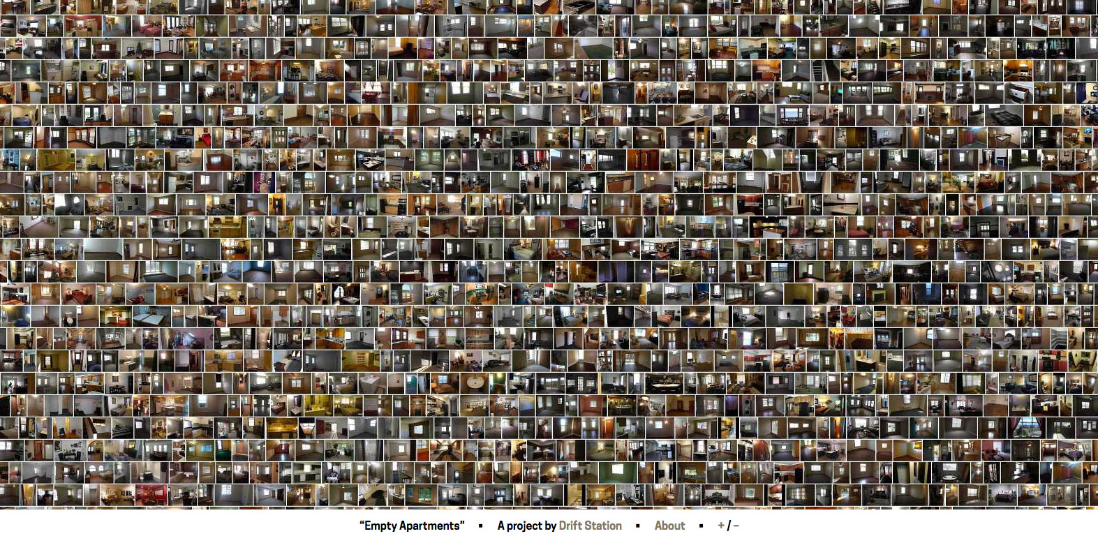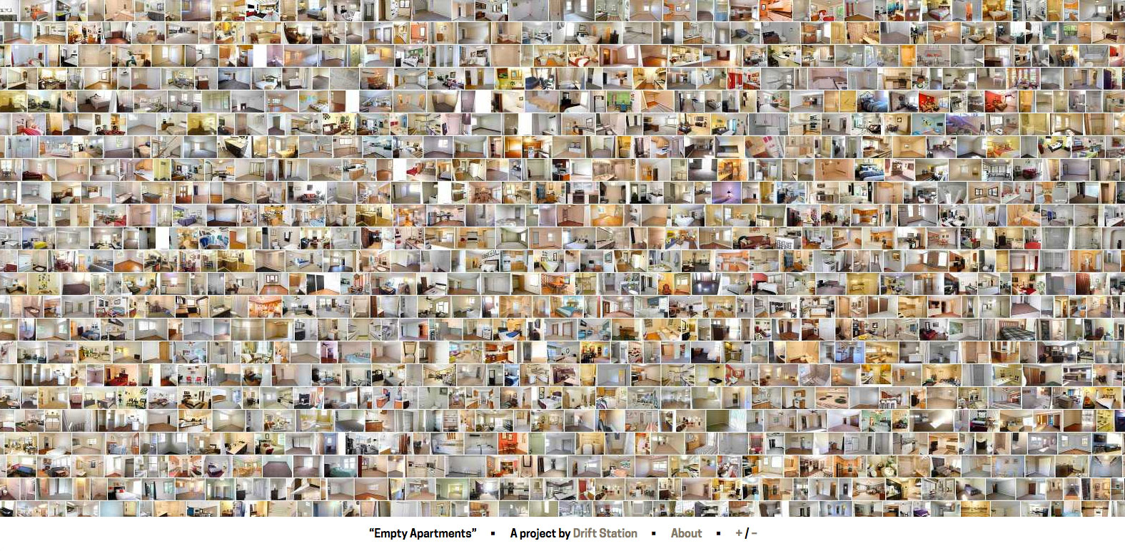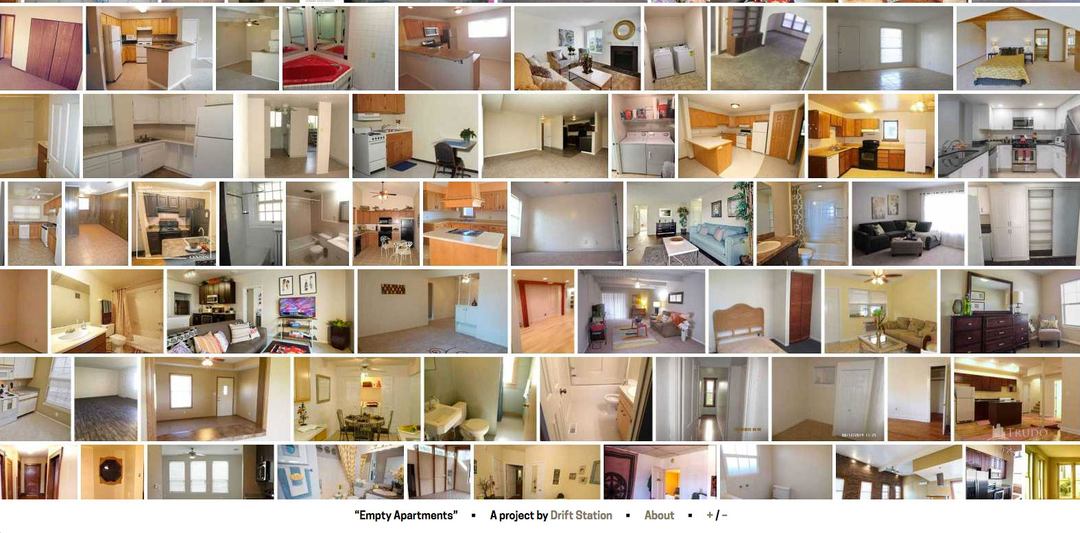 Empty Apartments is an online project consisting of approximately 125,000 photographs of apartments that were listed for rent on Craigslist on May 20, 2016. They were automatically scraped these images from the site, then manually sorted to remove exterior shots, ads, floorplans, and shared areas like gyms and foyers. The images are shown en masse, appearing as an endlessly scrolling field that reveals the transitional, intimate spaces where American renters carry out their private lives.