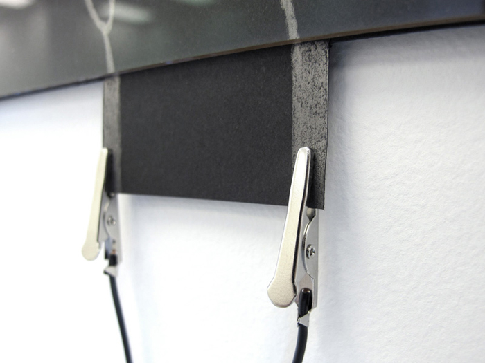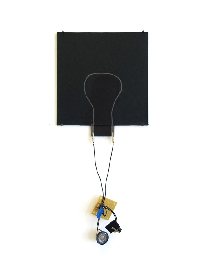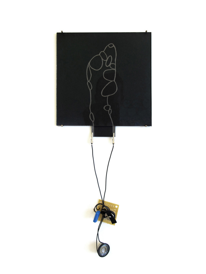 Caleb Coppock's drawings merge mark with electronic component: heavy graphite marks are connected to alligator clipped wires, which are in turn connected to small circuits that generate clicks and pulses as electricity literally flows through the drawn surface. The marks not only act as totemic abstraction, their length changes the sonic characterics emitted as well. Jamie Powell's small abstract paintings have logic built through years of exploration of the subtle interactions of color and shape. While not normally thought of as functional, abstraction like Powell's engages forms that have over time developed the same needs and constraints as a tool or piece of furniture. Matthew Sontheimer's intricate pen and pencil drawings are built from an obsessive internal logic, conflating the handwriting of his father with manufactured letterforms and found contours. Through these pieces, Sonnheimer unpacks the relationships between the written word, internal dialog, and the idea of a meaningful form.